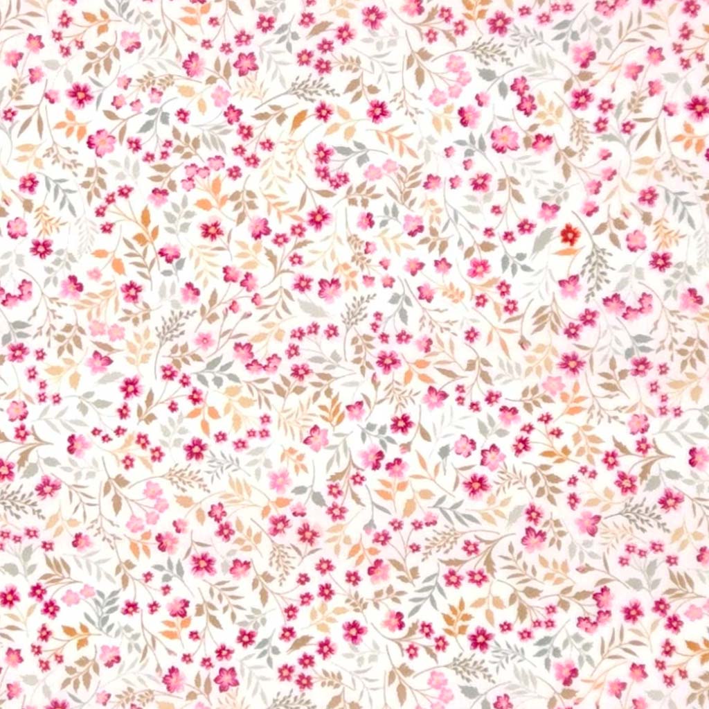 Bring a fresh and delicate touch to your projects with our Ditsy Pink Flower & Leaves floral polycotton fabric. Featuring charming pink flowers and soft green leaves on a crisp white background. Perfect for crafting or accessories.