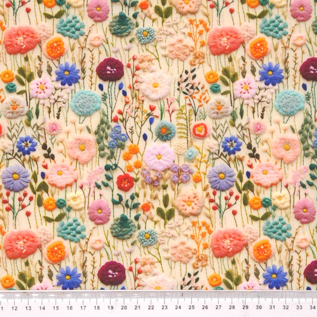 Vibrant embroidered flowers in pretty popping tones dance across lush green vines on this stunning cream polycotton blend. The intricate 3D floral detailing brings springtime charm to any project.