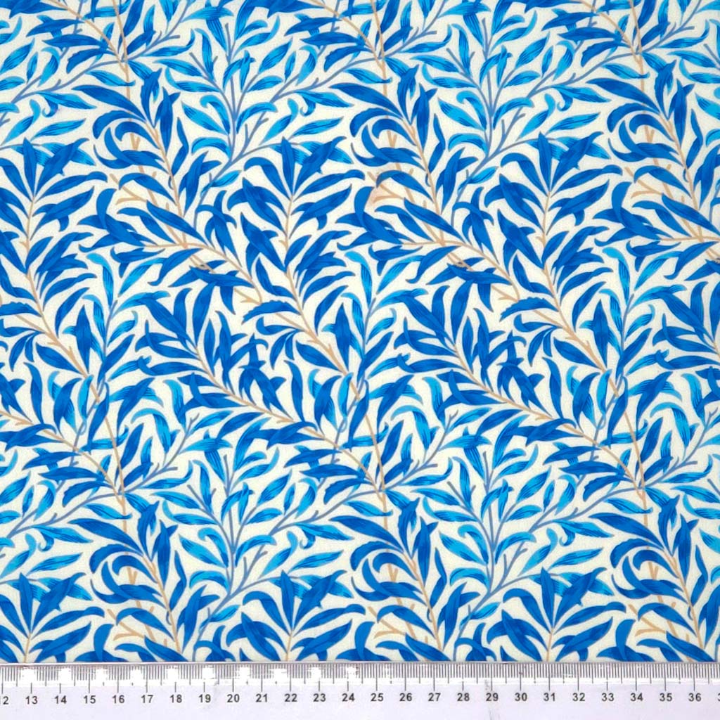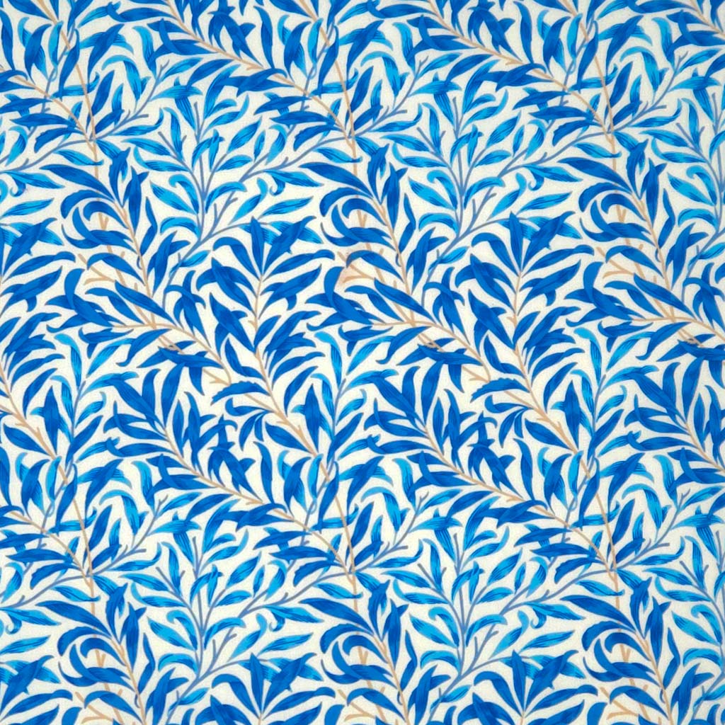 William Morris' timeless willow bough design with intertwining cornflower blue vines is printed onto a beige polycotton fabric.