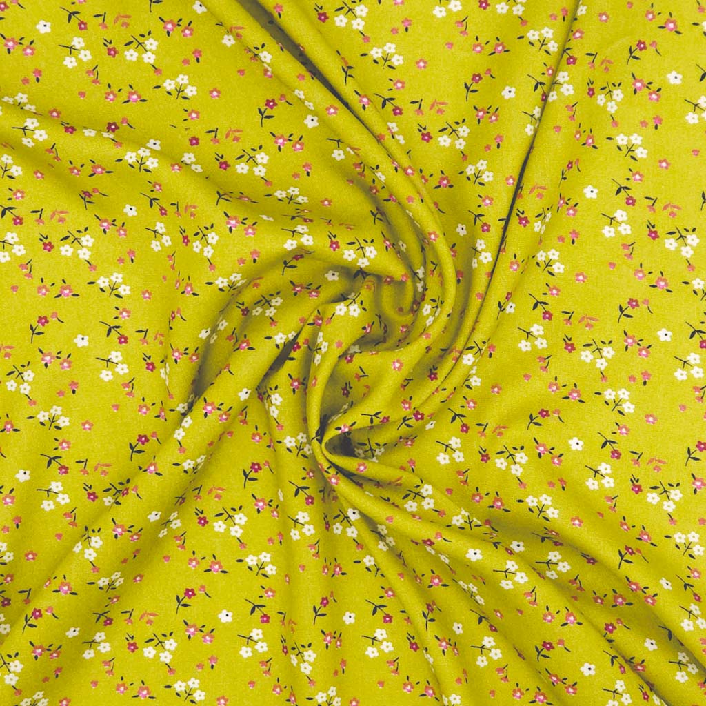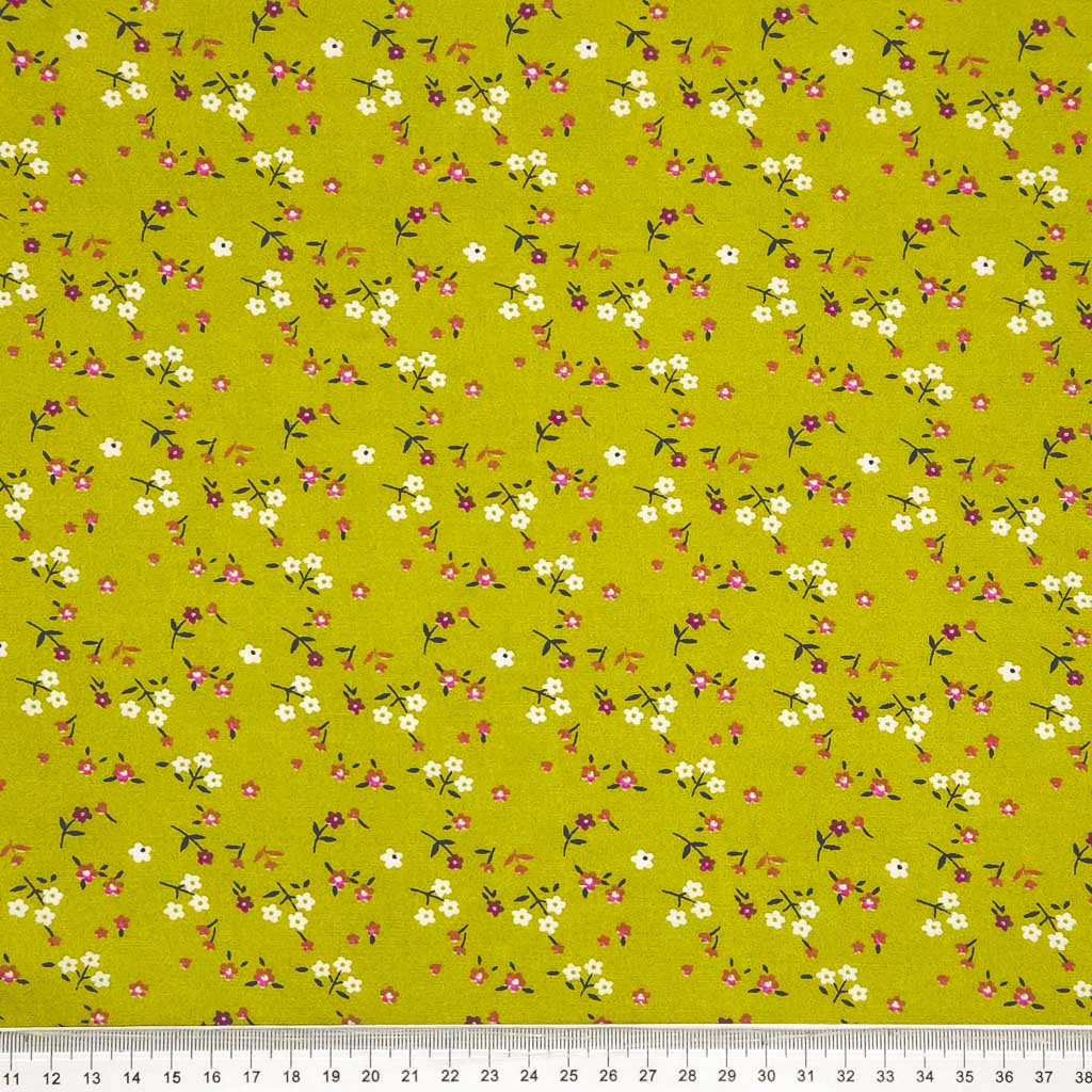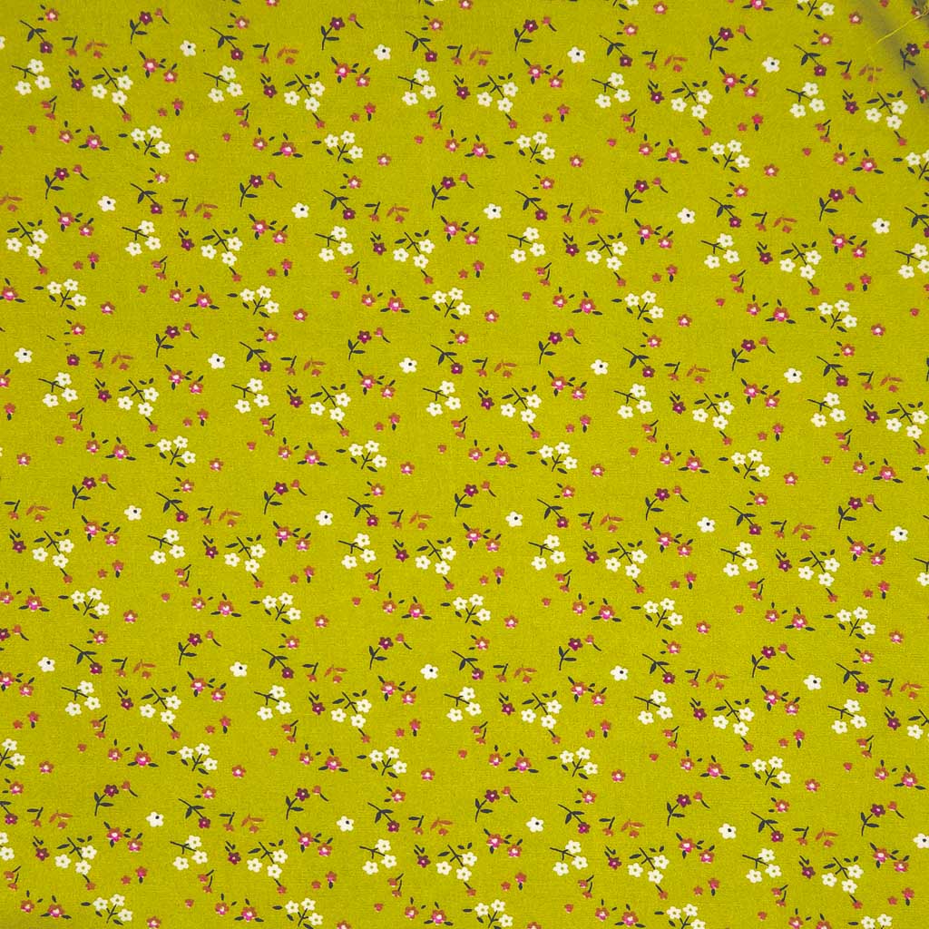 A beautifully subtle design of mini daisies in a pale lilac, white and magenta colour surrounded by a contrasting black stems on a olive green 100% viscose fabric.