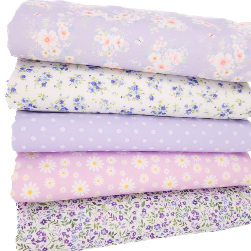 Mix & Match across all fat quarter bundlesBring delicate floral charm to your sewing projects with this pretty lilac floral bouquet fat quarter bundle. Features five polycotton fat quarters with different floral and spot designs.