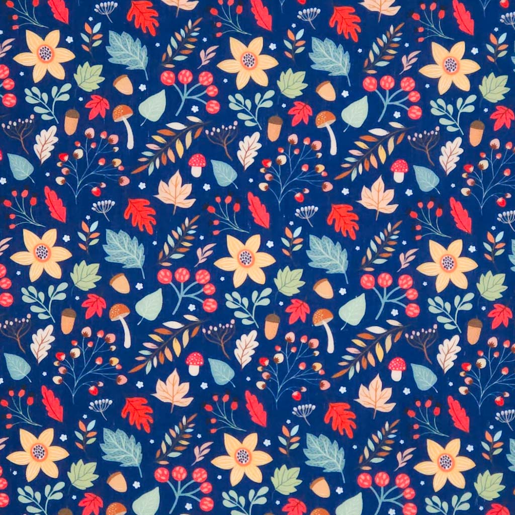 Capture the essence of autumn with this navy polycotton fabric, beautifully patterned with toadstools, flowers, acorns, and leaves. Perfect for crafting, its rich tones and nature-inspired design bring warmth and charm to any project.