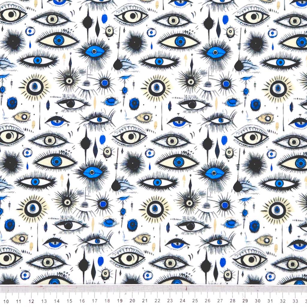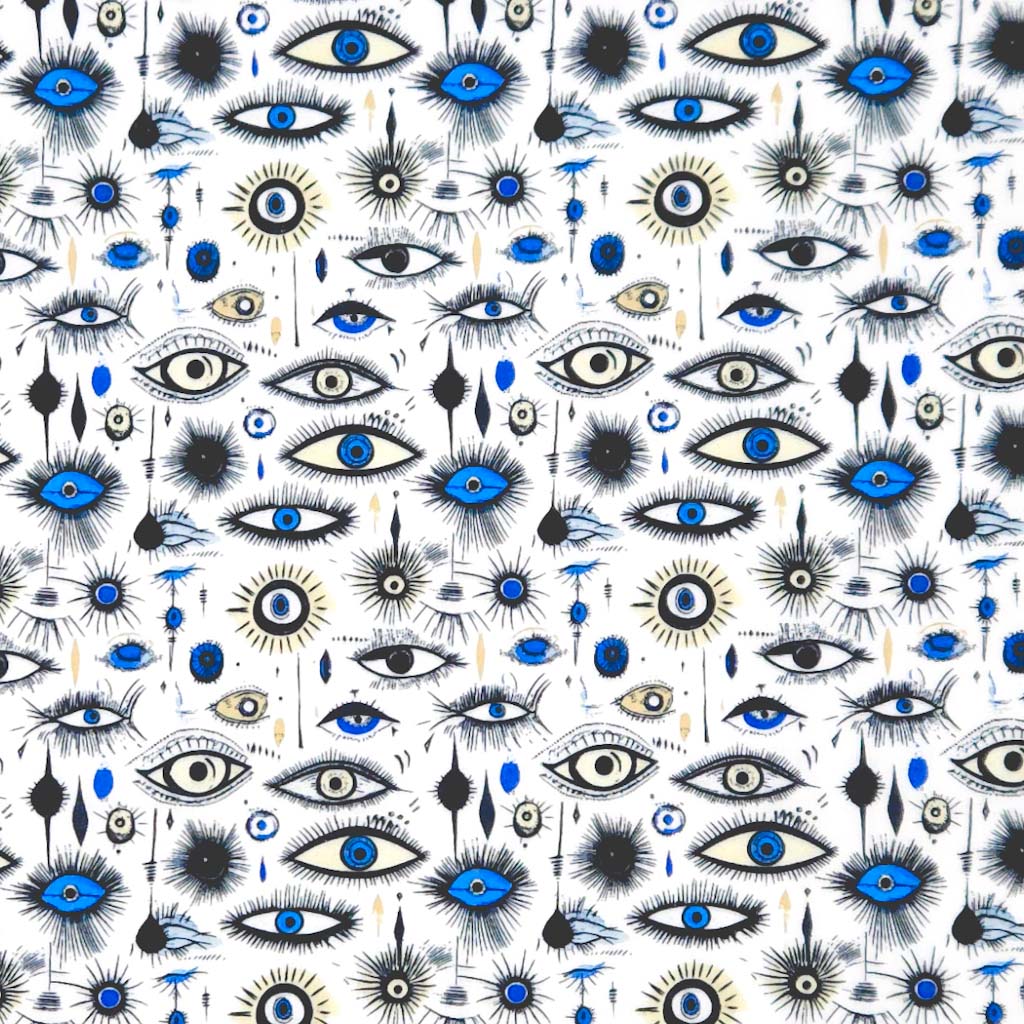 Features captivating blue and white eyes accented by long, floral-like black lashes, the striking design pops beautifully against the crisp white background.