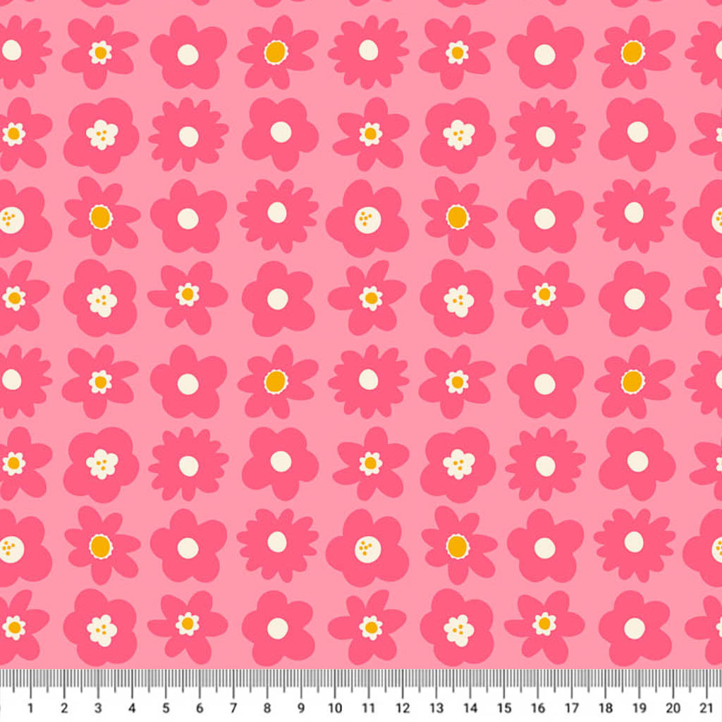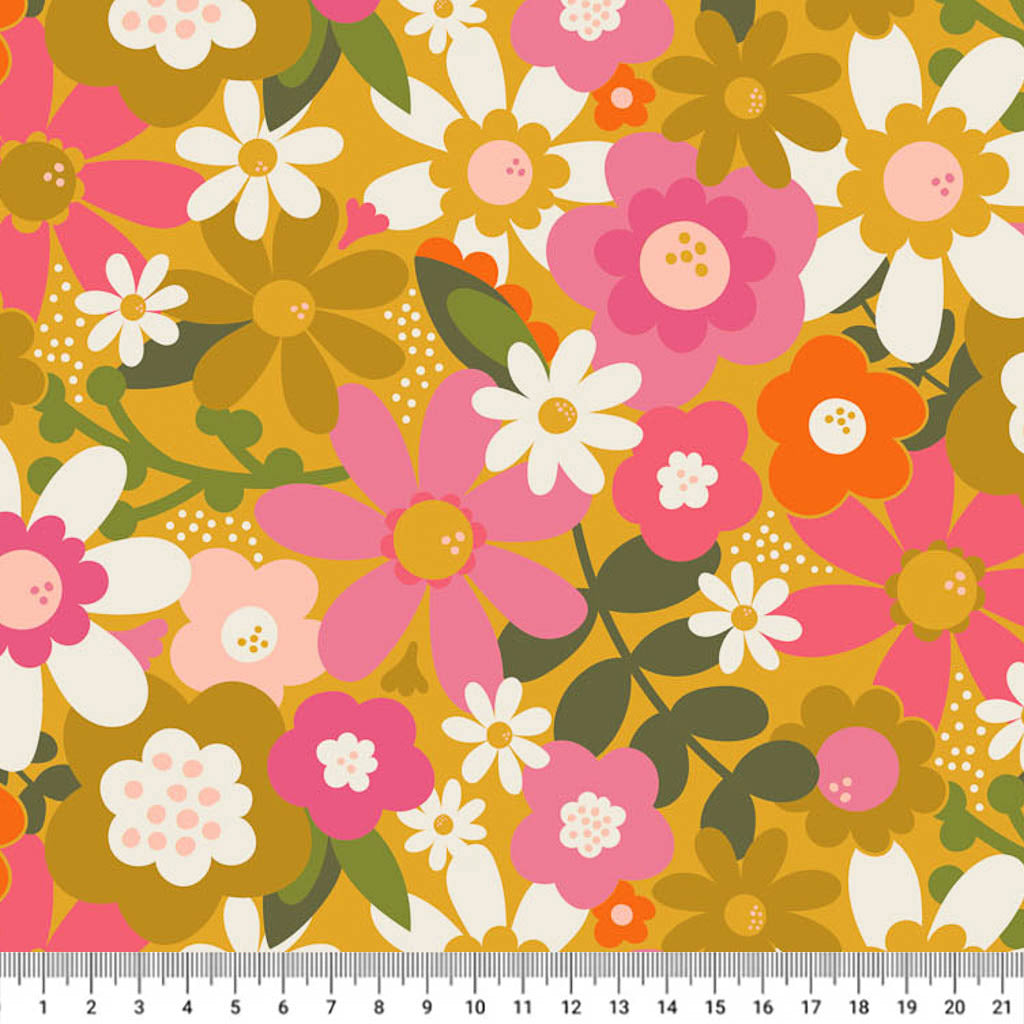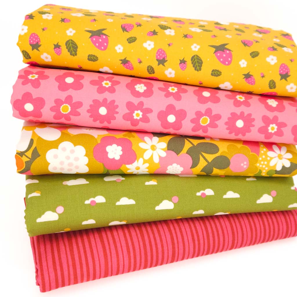 A fat quarter bundle of 5 fruit themed cotton fabrics in ochre and pink