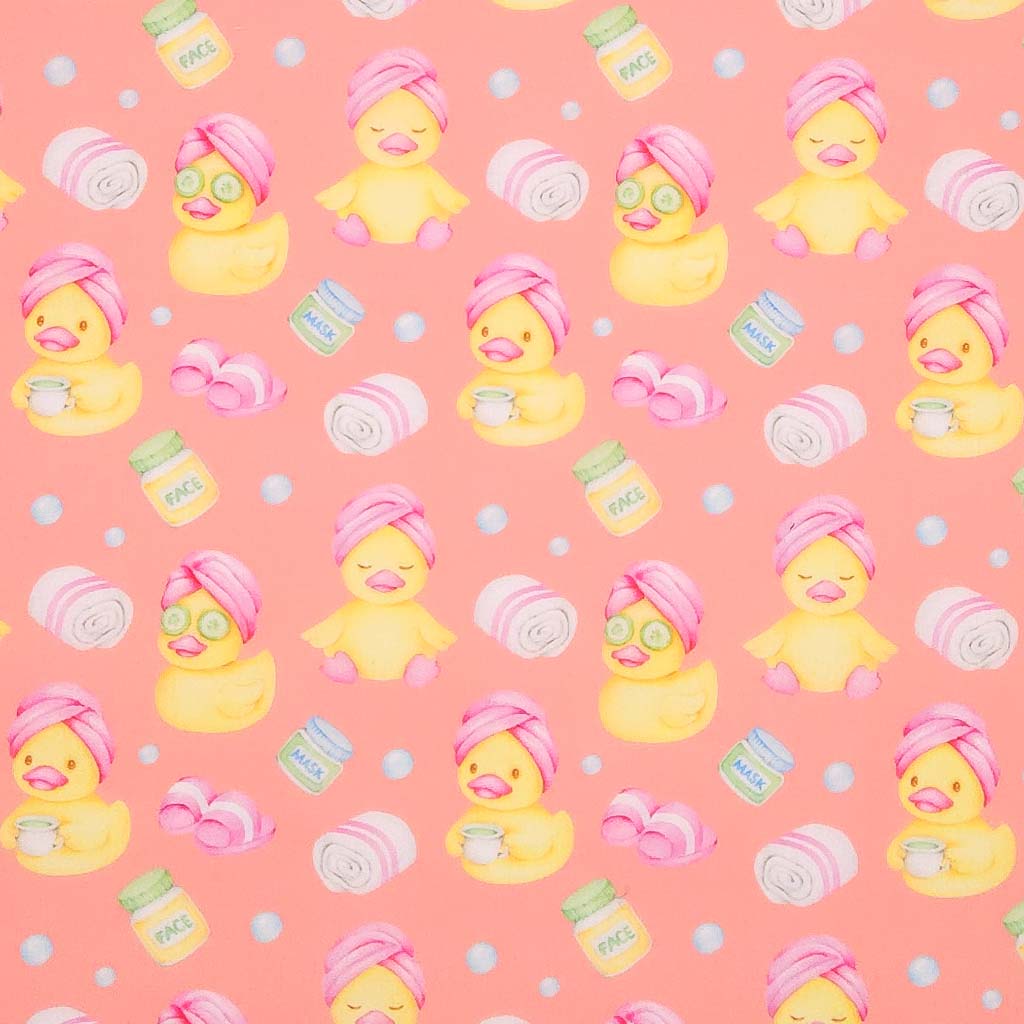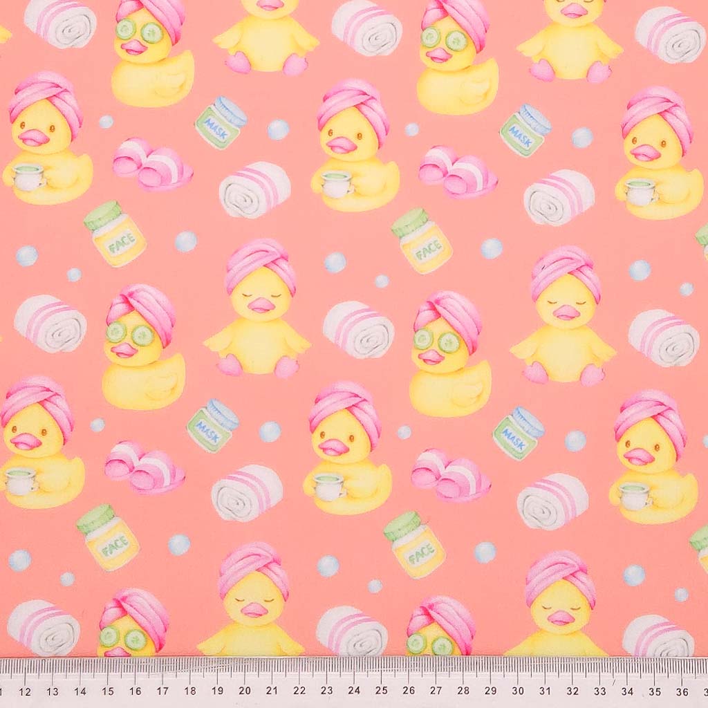 Dive into relaxation with this delightful polycotton fabric featuring adorable rubber ducks enjoying their ultimate spa day. Each duck is wrapped in hot pink towels with cucumber slices cooling their eyes, surrounded by face mask bottles, plush towels and cosy slippers scattered across a vibrant coral background. Perfect for adding a splash of fun and personality to your crafts.