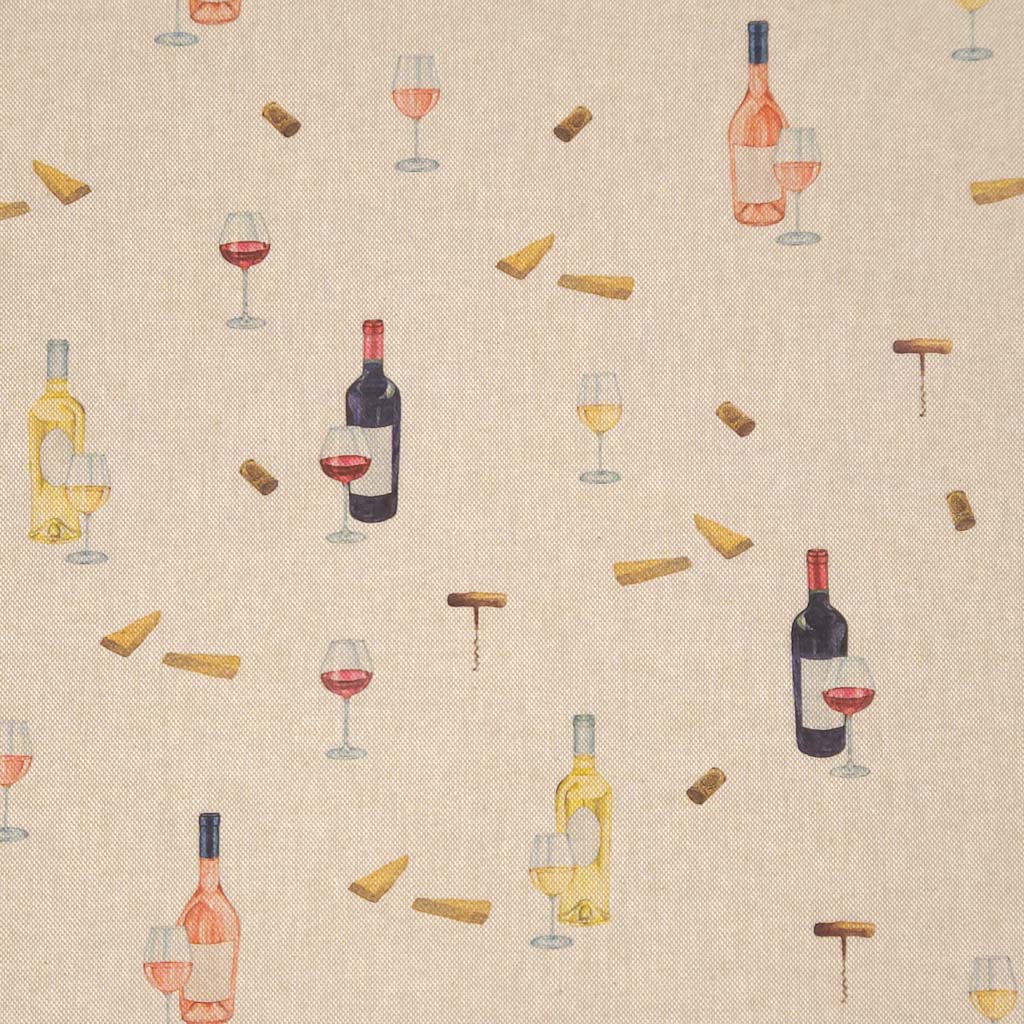 Pattern of wine bottles, glasses, and corks on a beige fabric