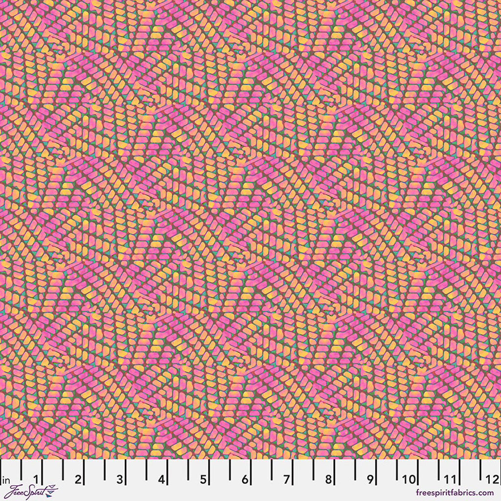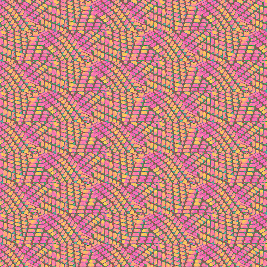 Glitter Fairy is part of the Kaleidoscope collection, inspired by the playful shapes and colors generated by the vintage toy. The collection celebrates the perfectly imperfect patterns created by light as it passes through bits of colored glass and is reflected by the object's internal mirrors. The sixteen-print collection features bold, geometric designs of varied scales and richly textured blenders that hit every note on the colour spectrum.