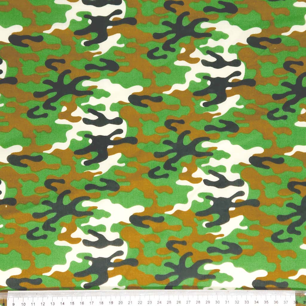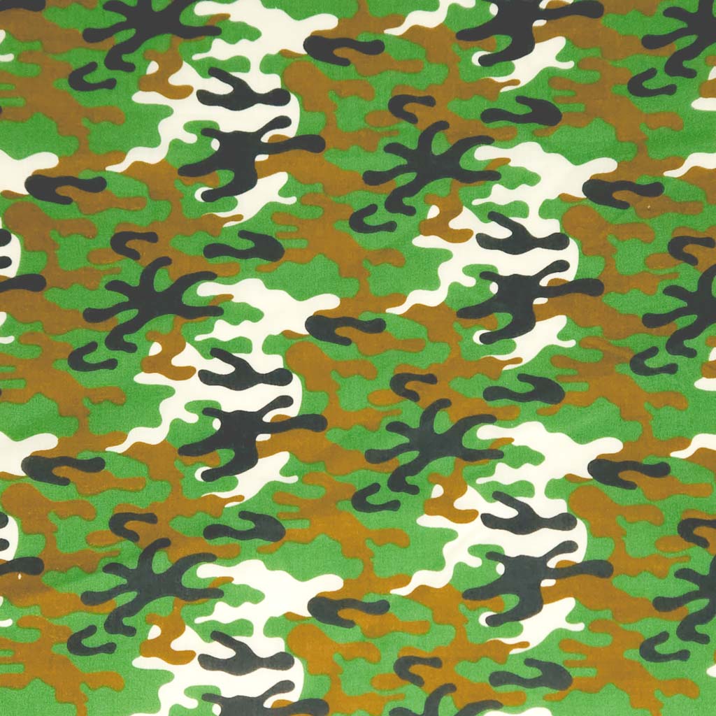 A dark-toned camouflage of green, brown, black and white.