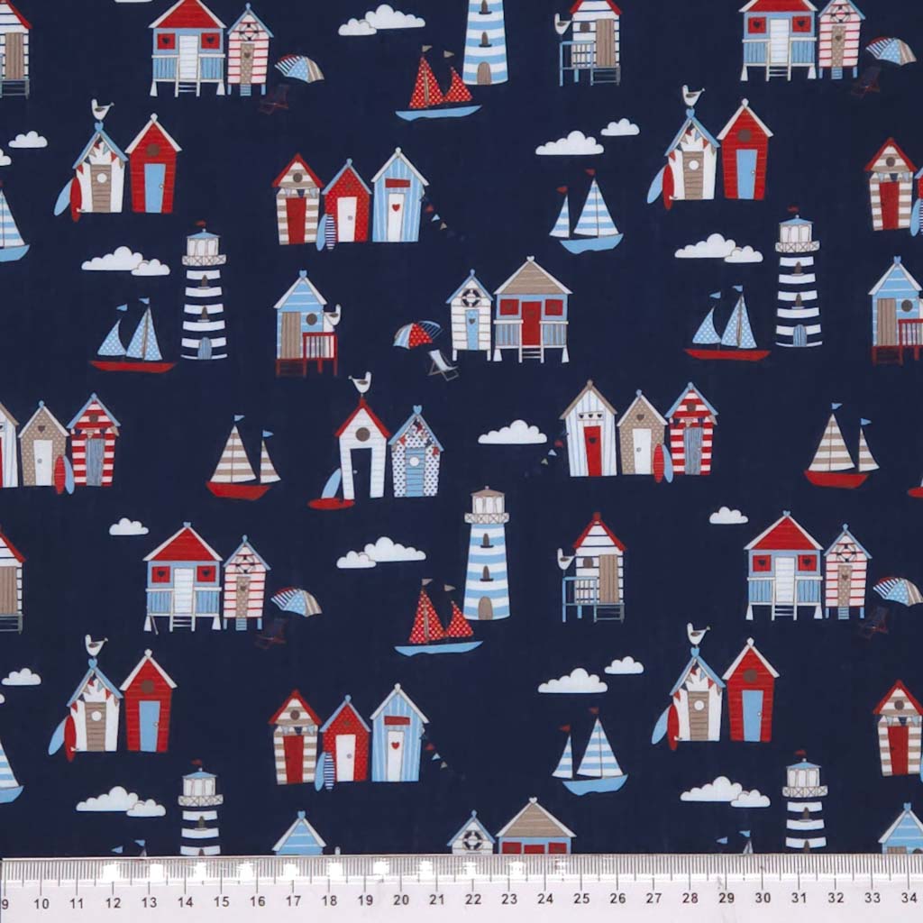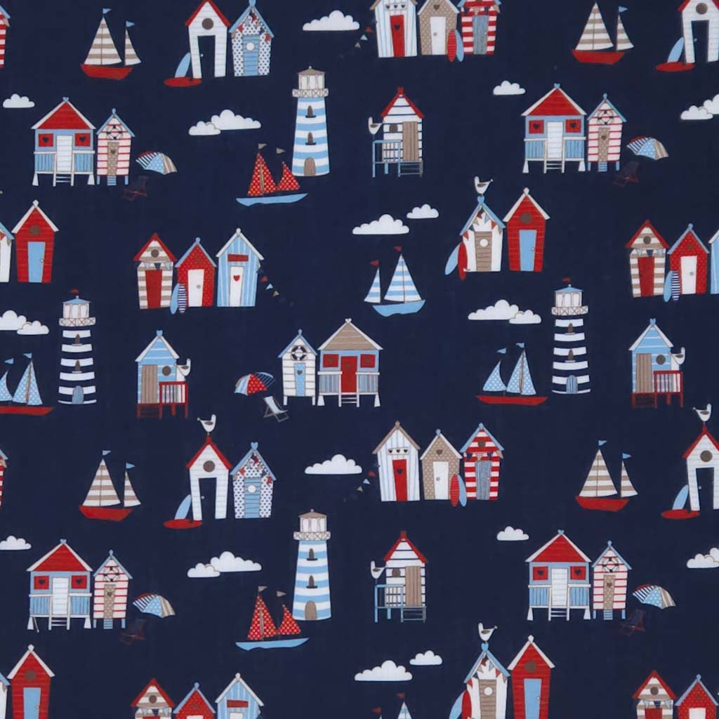 Bring seaside charm to your projects with this delightful polycotton fabric featuring adorable miniature beach huts and sailboats scattered across a rich navy background.