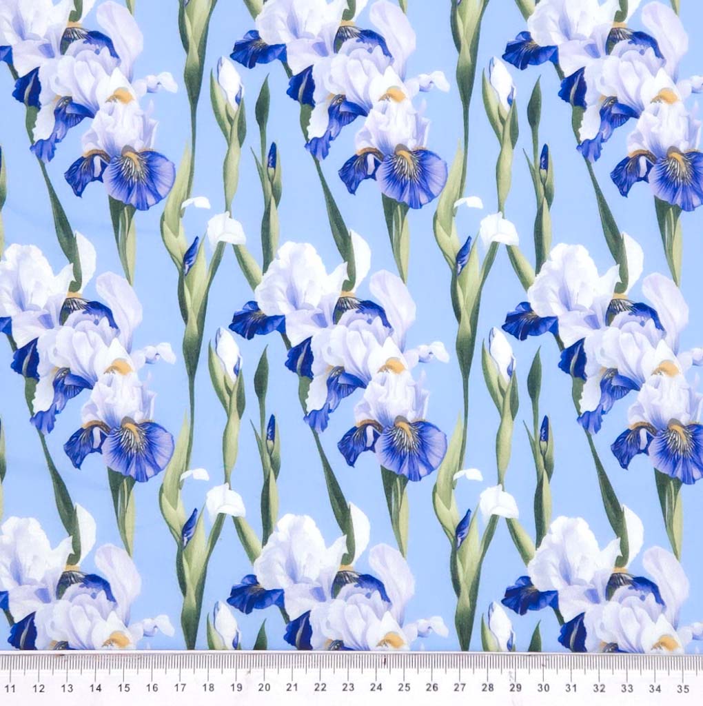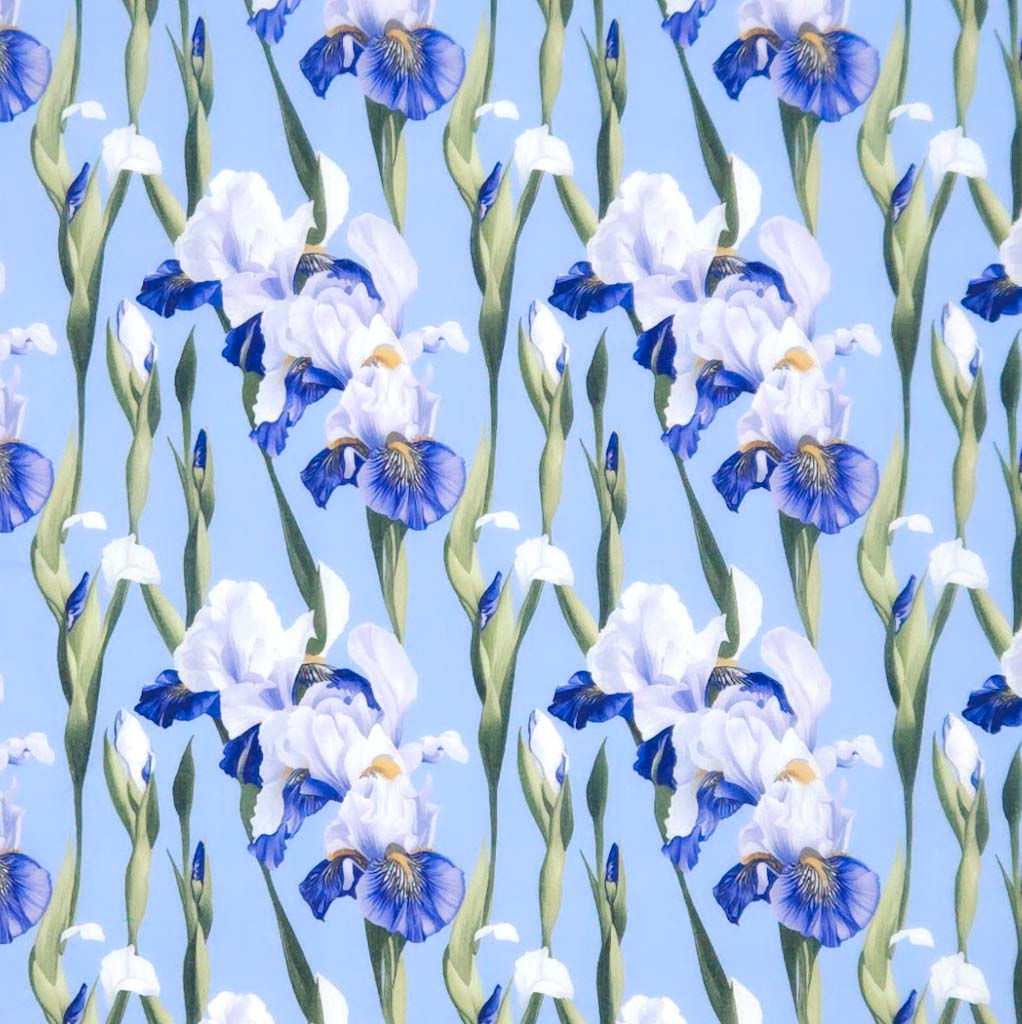 Rich purple irises growing boldly along leafy reeds against a bright sky-blue polycotton fabric, it brings a fresh, uplifting touch to any project.