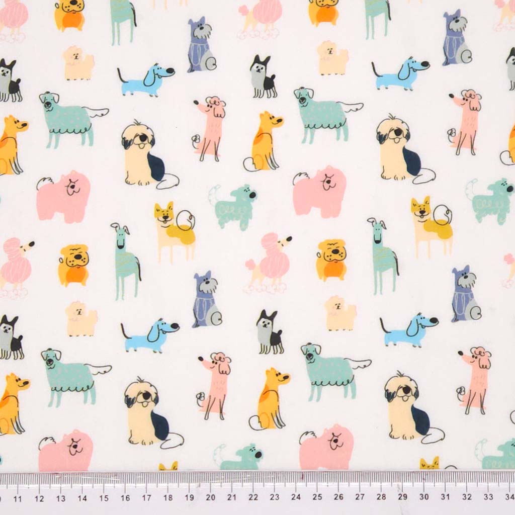 Pattern of colorful cartoon dogs on a white polycotton fabric with a ruler at the bottom.