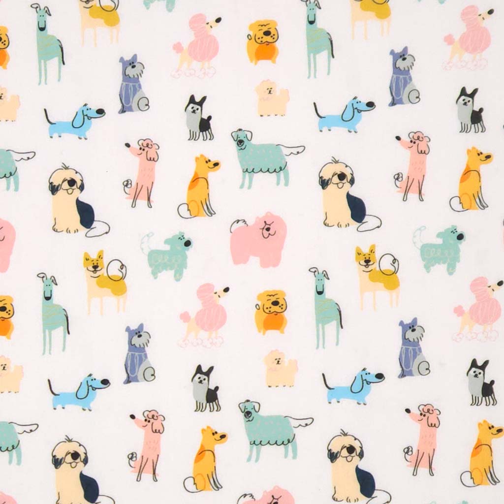 This playful polycotton blend showcases adorable dog breed doodles scattered across soft pastel colour splats, creating a cheerful and fun doggy design.