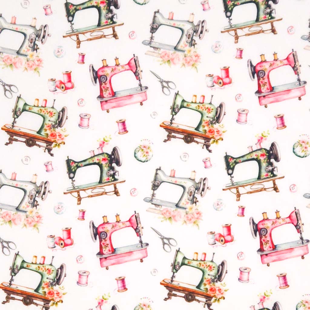 Charming retro sewing machines in soft sage and blush pink, surrounded by colourful threads and scattered buttons, this polycotton design celebrates the joy of crafting.