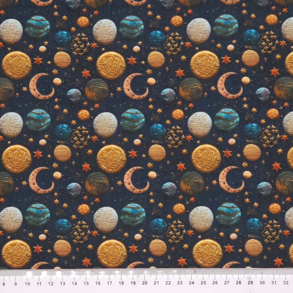 Intricately embroidered moons and stars shimmer in luxurious gold and silver tones, creating stunning depth and dimension on a contrasting navy polycotton fabric.