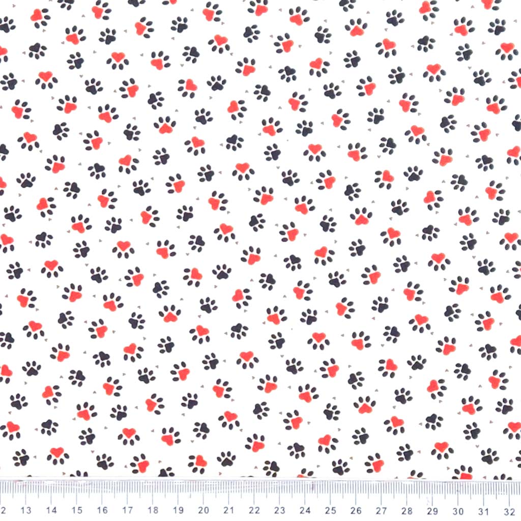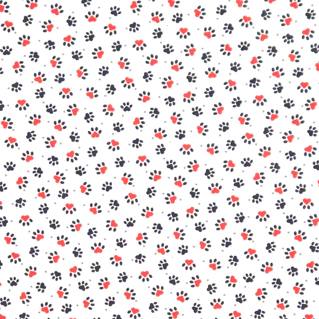 Pattern of black paw prints and red hearts on a white background