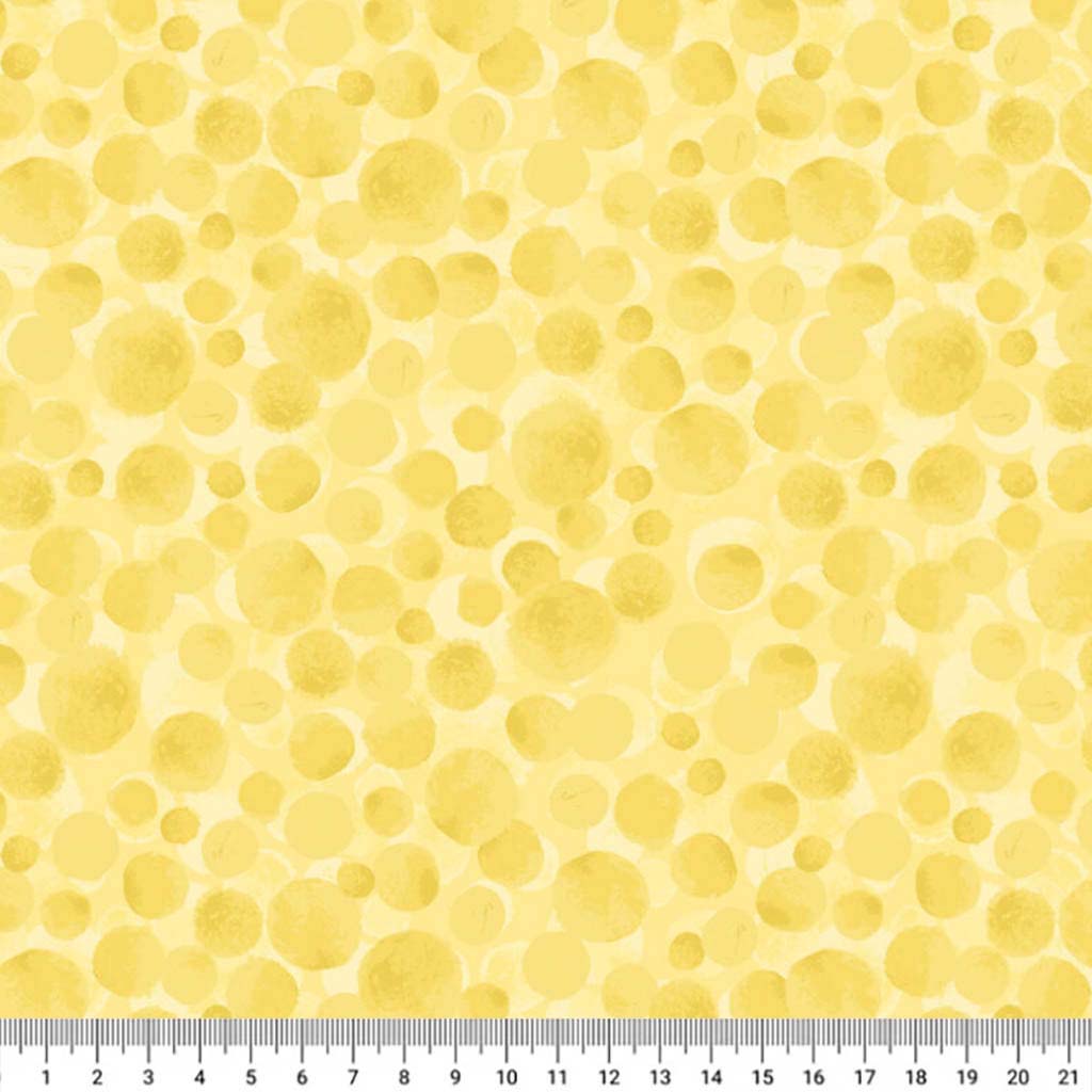 Lemon yellow bumbleberries design printed on cotton quilting fabric with a cm ruler