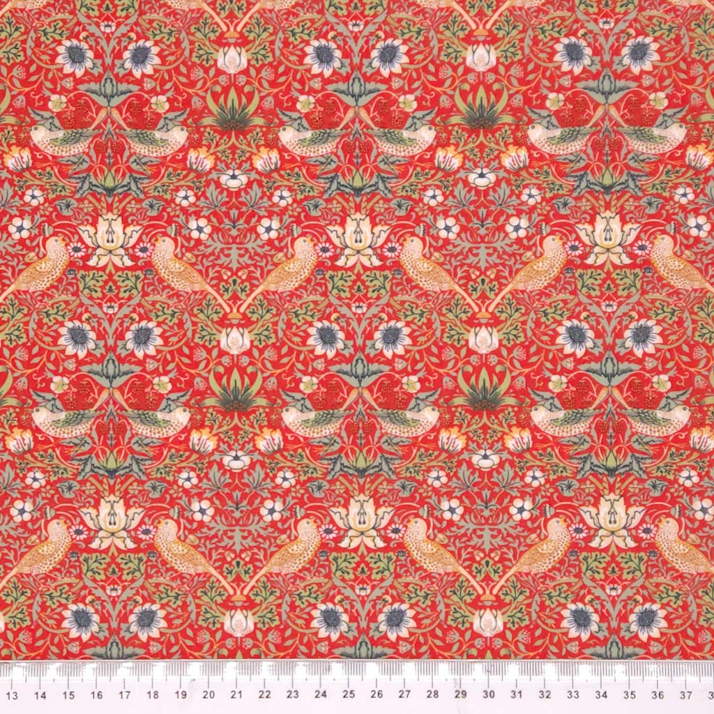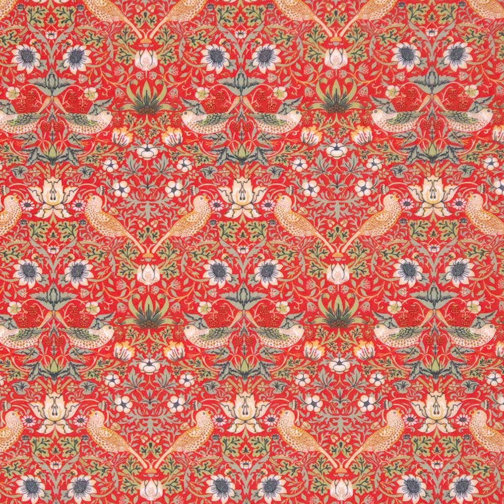 William Morris Strawberry Thief design in rich red tones. Beautiful birds surrounded by a mosaic of bright strawberries and detailed plants, printed on a polycotton fabric.