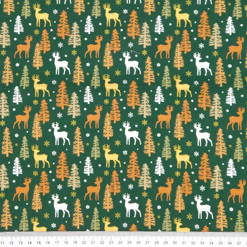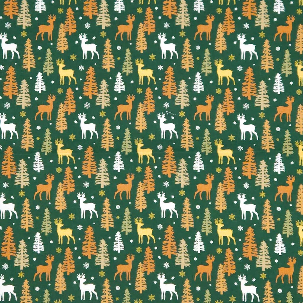 Celebrate the festive season with this charming Christmas cotton fabric featuring metallic deer silhouettes nestled among brown trees and twinkling stars on a dusk green background. Perfect for your cosy Christmas crafts.