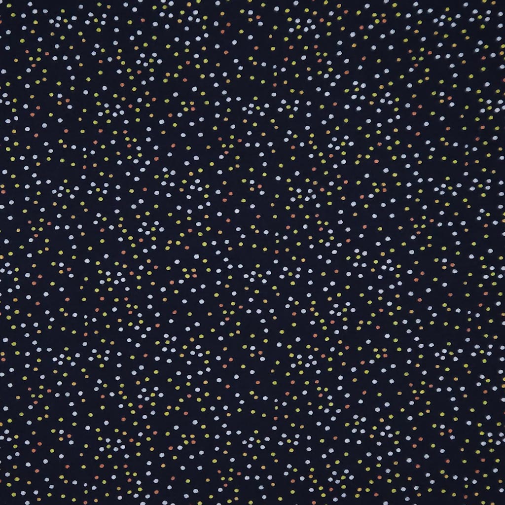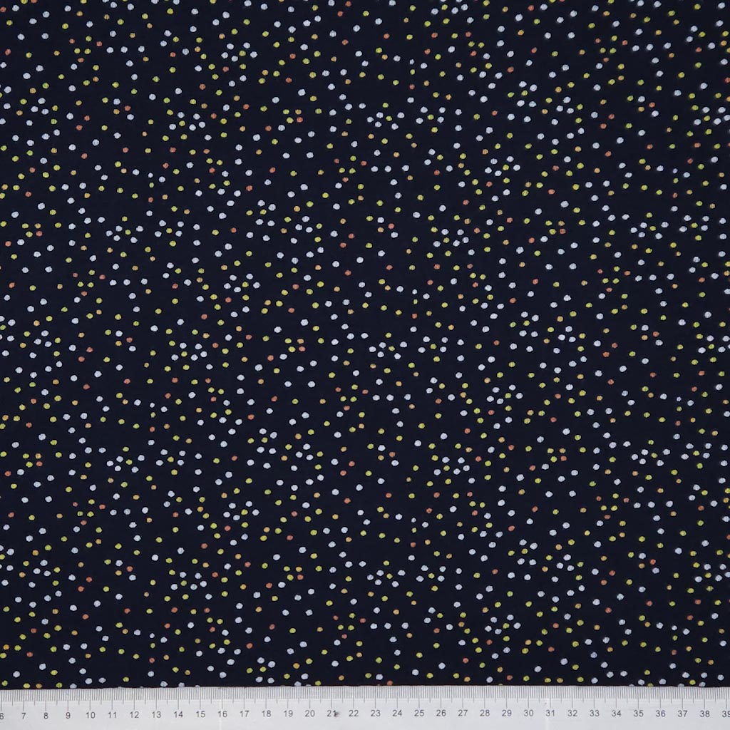 This fabric features mini spots of neutral cream, gold and green scattered across a navy viscose ponteroma. A timeless design for your timeless creations.