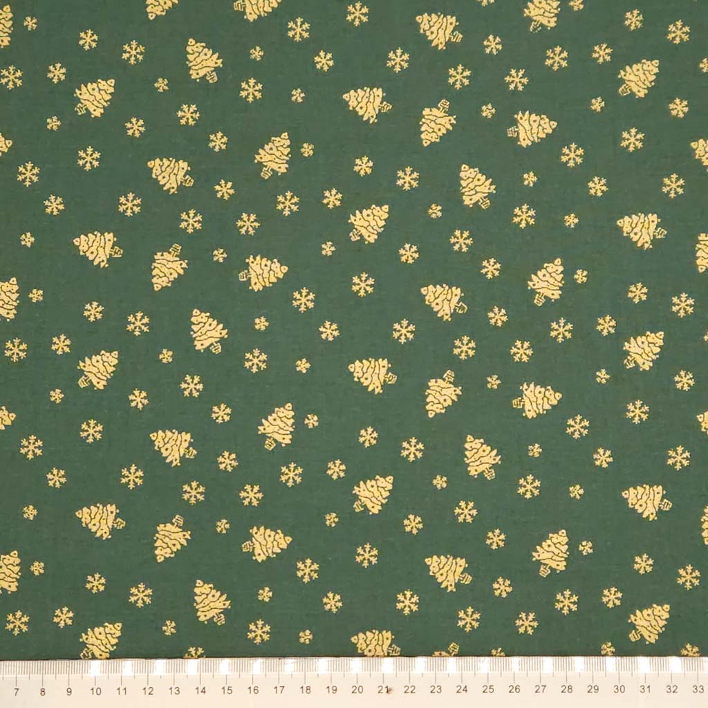 Gold Trees & Snowflakes on Green - Christmas Cotton Fabric