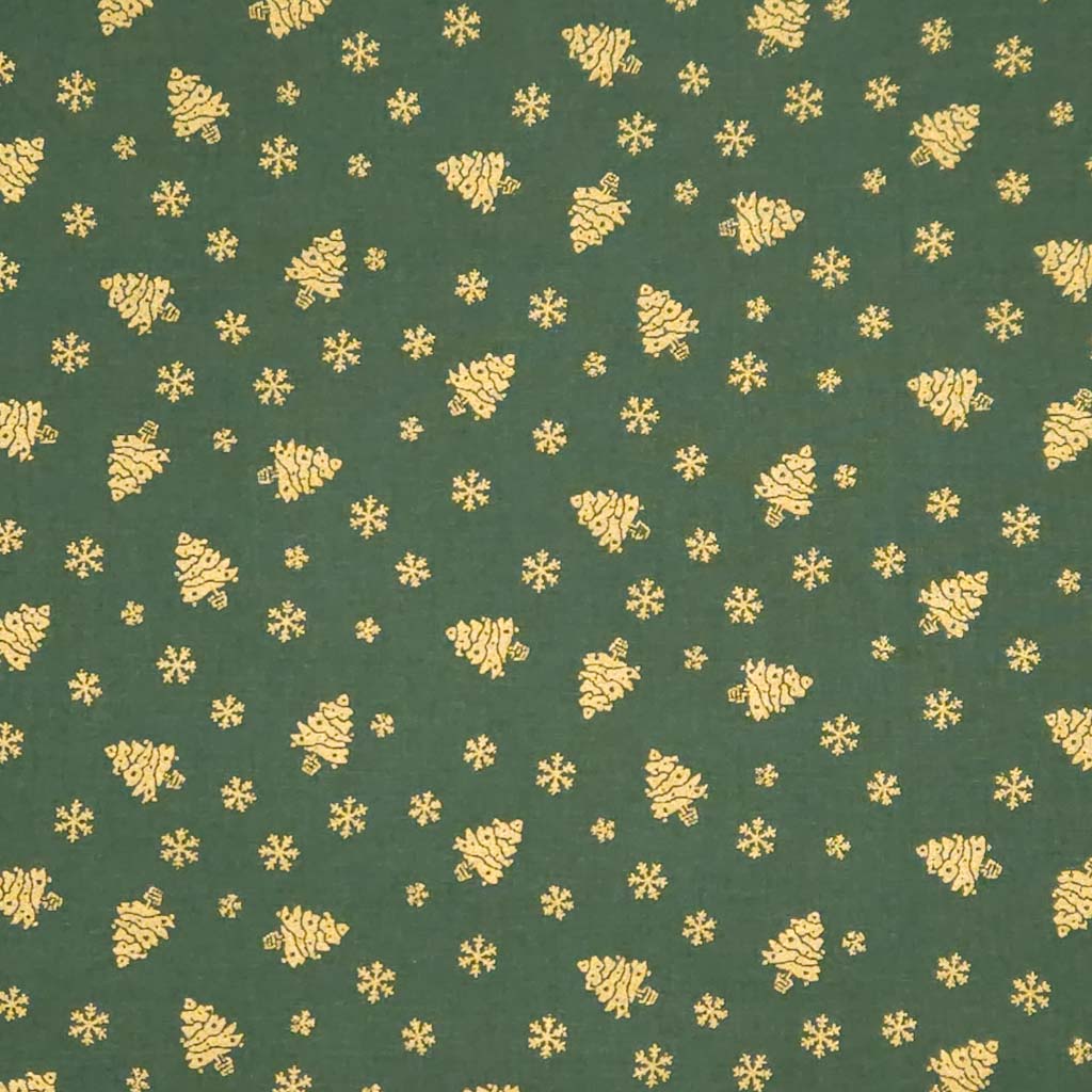 Add festive sparkle to your Christmas sewing projects with this Gold Trees & Snowflakes on Green cotton fabric. Its charming gold christmas trees and snowflakes on a bottle green background bring a joyful seasonal touch to your christmas projects. STANDARD 100 by OEKO-TEX® certified.