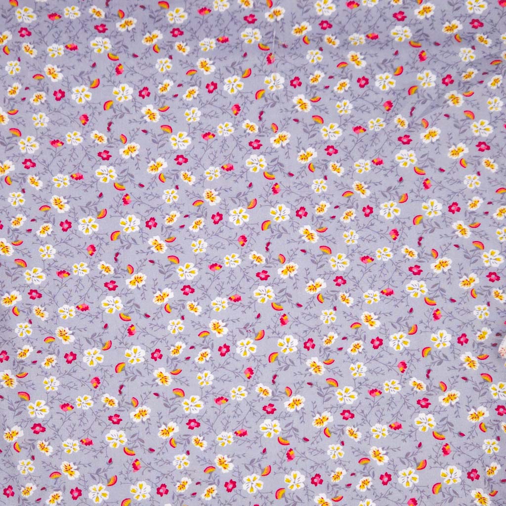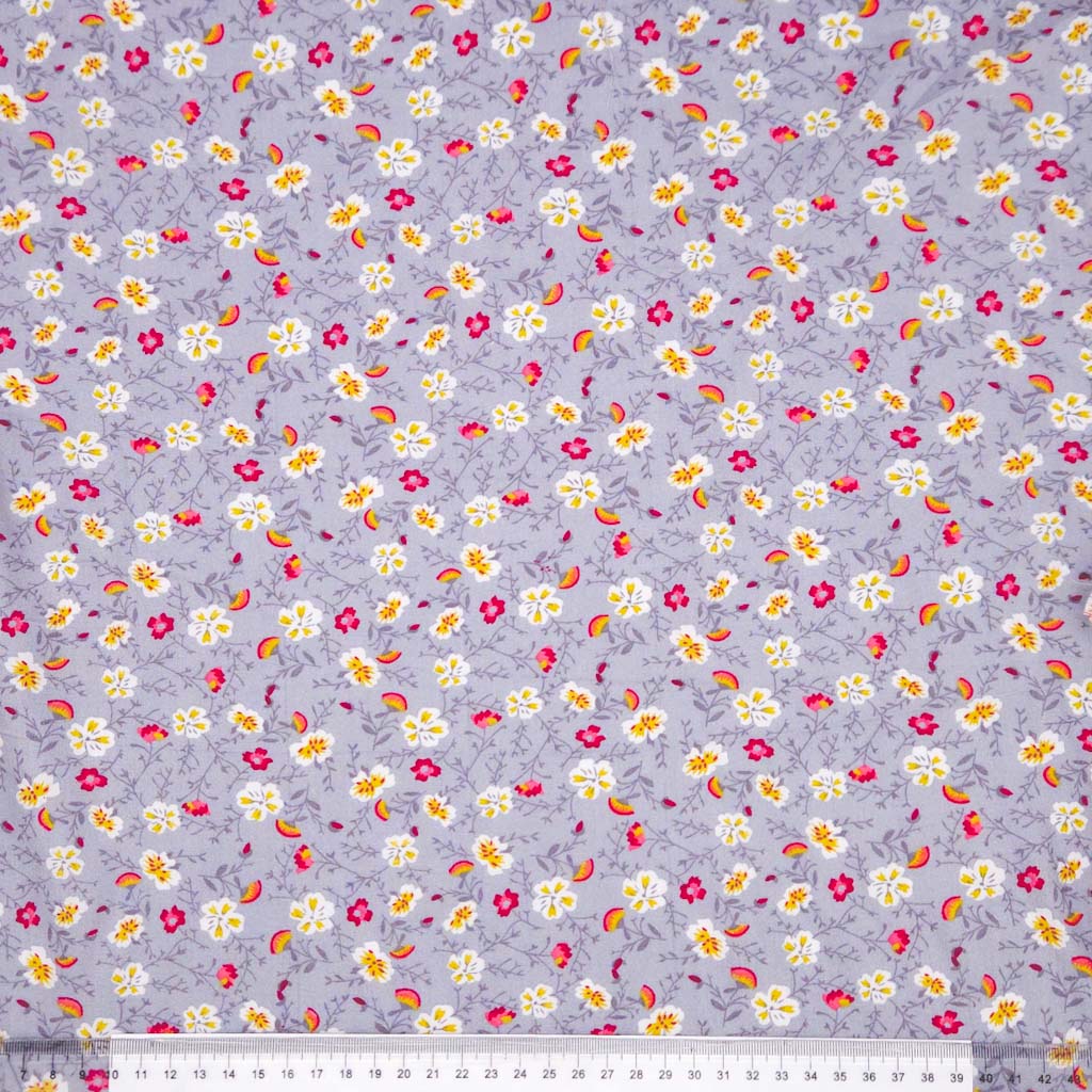 A gorgeous design of golden yellow and rich cerise mini flowers alongside sunset fan flowers on a beautiful dark grey 100% viscose fabric. Perfect for any dressmaking fabric.
