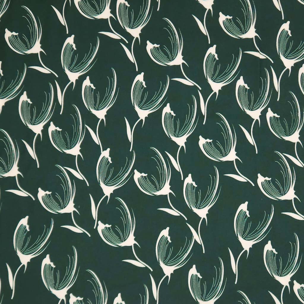 Make a bold statement with this bottle green viscose fabric featuring striking cream flowers. Its vibrant contrast and soft, flowing texture bring a daring edge to your dressmaking projects.